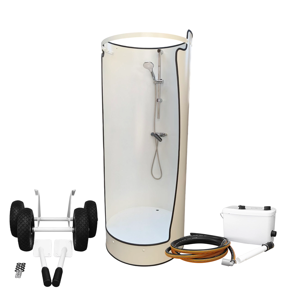 Auch bei Transport und Anschluss macht die Washbox es Ihnen leicht. Denn sie wird an das vorhandene Warmwassersystem oder in Verbindung über das Alternativzubehör angeschlossen. Sie ist mobil, flexibel und sofort einsatzbereit. Der Aufstellort bleibt fest. Der Betrieb funktioniert ohne Abwasserpumpe, da das Wasser direkt über den Abfluss abgeleitet werden kann. Natürlich kann alternativ eine Hebeanlage, die das Abwasser abpumpt, mitbestellt werden. Im Standartlieferumfang ist die Dusche mit Mischarmatur, Brause, Duschvorhang ausgestattet. Die mobile Dusche wird innen und außen weiß (RAL 9003 Signalweiß) ausgeliefert.