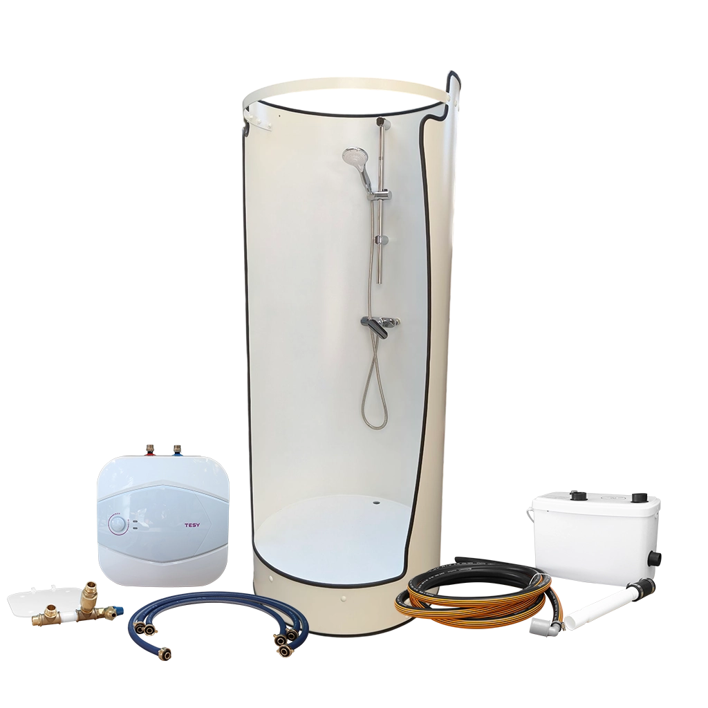 Auch bei Transport und Anschluss macht die Washbox es Ihnen leicht. Denn sie wird an das vorhandene Warmwassersystem oder in Verbindung über das Alternativzubehör angeschlossen. Sie ist mobil, flexibel und sofort einsatzbereit. Der Aufstellort bleibt fest. Der Betrieb funktioniert ohne Abwasserpumpe, da das Wasser direkt über den Abfluss abgeleitet werden kann. Natürlich kann alternativ eine Hebeanlage, die das Abwasser abpumpt, mitbestellt werden. Im Standartlieferumfang ist die Dusche mit Mischarmatur, Brause, Duschvorhang ausgestattet. Die mobile Dusche wird innen und außen weiß (RAL 9003 Signalweiß) ausgeliefert.